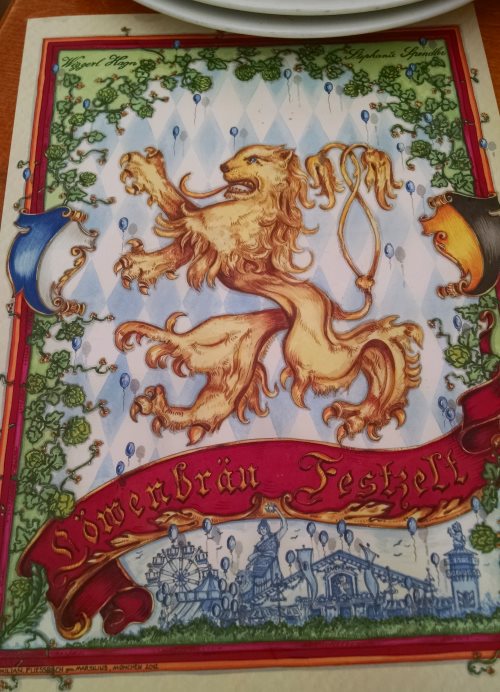 Monday was the big day. We had to shift lodgings to the Arthotel near the train station for our last night in Munich. We checked out of the VRBO and schlepped our bags through the subway to the main train station and then to drop them in the hotel's baggage storage room. Then it was a short walk back to the Theresienwiese grounds where we met up with the group and marched into the tent for our 12:00 - 4:30 shift. We had two tables for a total of 20 seats, and each seat came with vouchers for two liters of bier and a half roast chicken.