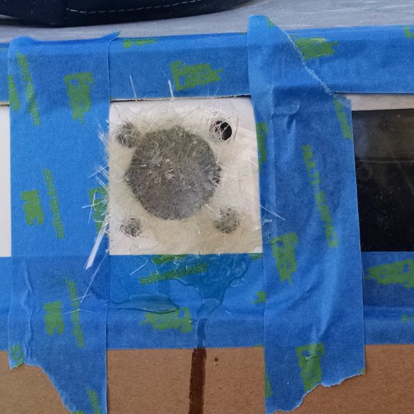 There are only two holes bigger than screw holes, and one of them isn't very large at all. For the small one, I just beveled the edge a bit, backed it with duct tape from the inside, and did a best efforts fill job with scraps of fiberglass cloth, matt, and resin. The larger one got a backer of cardboard and duct tape, sealed tight on the inside to guard agains resin drips, and with a drop cloth in place just in case. The layup was pretty straighforward. I just wish I had been able to get more of a bevel on the upper side of the big hole, but there just wasn't room. Ideally you want a 12:1 bevel, so for my 5/16" patch I should have ground out a bevel a full 4.5 inches all around. If it was in the hull or topsides I certainly would have, but in this area I did the best I could and I think it will be fine.