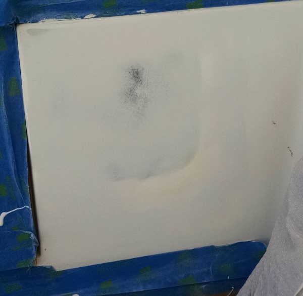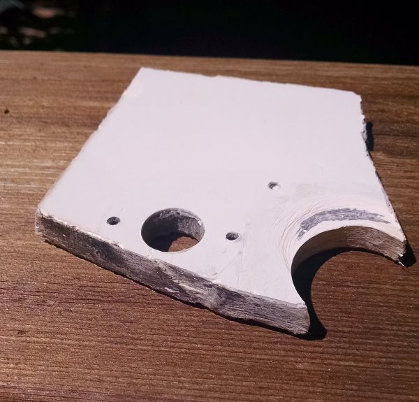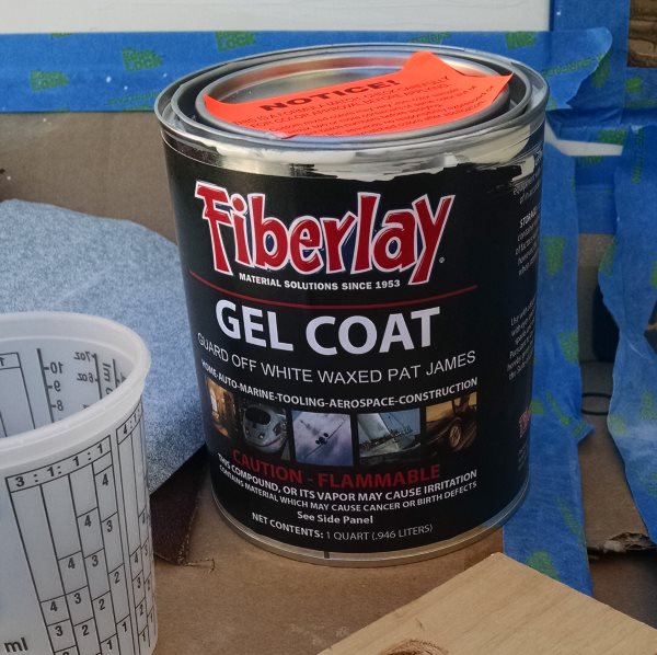 I took a sample to Fiberlay in Kent to get some gel coat custom tinted to match. How do you get a sample? You embiggen the hole you are already fixing to cut out a big piece of scrap. Fiberlay wanted a piece about the size of a business card. I considered using my jigsaw but ended up using the Fein Multimaster which did a "fine" (lol) job of neatly cutting the sample for matching. The guy at the Fiberlay showroom was great, just the right kind of friendly gray-haired-guy-in-a-ponytail who you know has decades of experience with fiberglass. I've done a fair bit of fiberglass repairs with epoxy and just figured that would be the way to go again. He was quick to correct this plan. He says epoxy is great for many things and he wouldn't use anything else when bonding to wood, but for this and most jobs cloth and polyester resin is the right answer. And it's less costly, cures faster, and then there is the little detail that gel coat won't bond to epoxy...oops my plan had a fatal flaw! He did evince some respect at my knowledge that the curing process is exothermic and that the patch should be started from the largeest size and go smaller, to get the largest bonding surface. I was encouraged by his reassurance that fairing it all with a little bondo will be fine before applying the gel coat. 3 days later, my own personally branded shade of off-white waxed gel coat was ready for pickup.