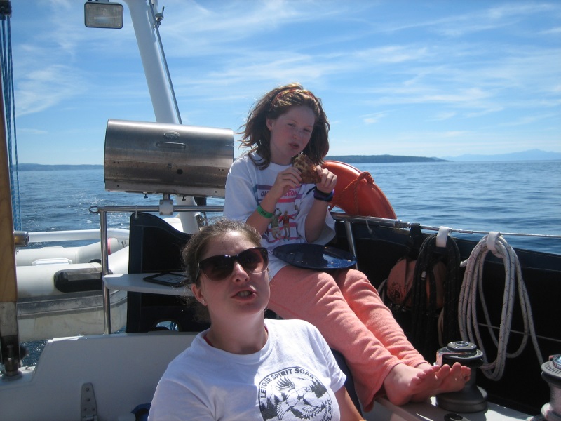 You look right out over the floating breakwater at the Strait and Savory Island. It is a busy little harbor with constant comings and goings and lots of interesting boats to check out. There are a couple water taxis that buzz campers back and forth from Savory Island. The one thing it lacks is a good swimming option. Swimming in the marina is not a great idea what with the electrolysis risk and general hazards, and it isn't exactly a park-like location. It is pretty much right smack on the strait. It was quite hot by the time we were tied up and squared away with power connected, water tanks filled, etc. and I was drenched in sweat. Kim was getting worried I might expire from heatstroke and offered me a dockside hose drenching.