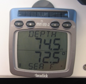 There was a bit of a breeze so we hung out to make sure the anchor was solidly holding us while we swam and enjoyed lunch. The water temperature was a very pleasant 72 degrees F. We were entertained by a small hobie cat that zipped around the bay in the breeze and planned our trip to the lake.