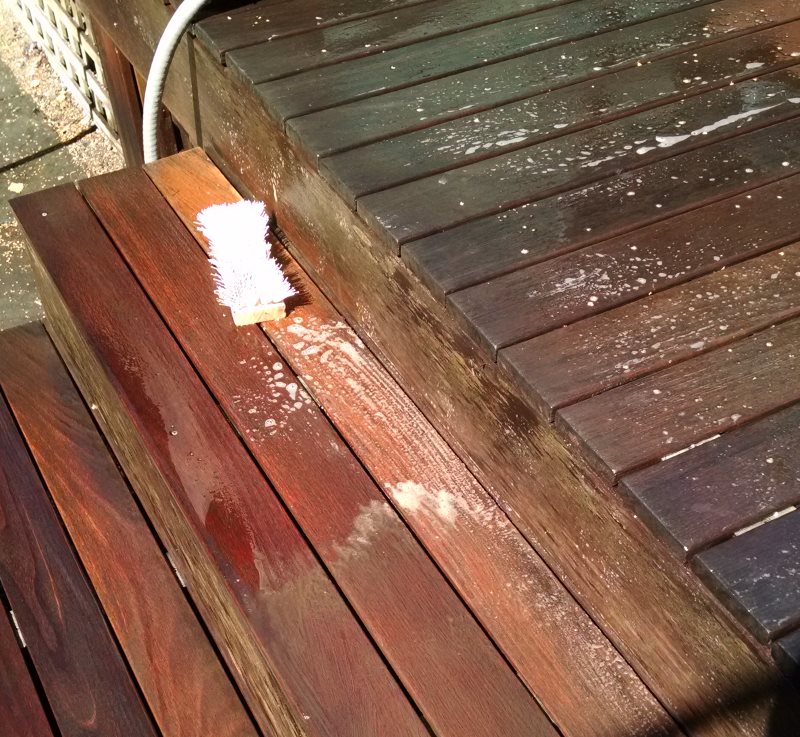 My detergent mix is..well I try different things. Usually it is Oxyclean, TSP, and a little Dawn mixed up hot in a 1-gallon batch and applied by garden sprayer. I have also used Restore-A-Deck which works well, but maybe not much better than the OxyClean mix. The RAD product seamed to foam up a bit more on its own, but I'm not convinced it cleans better. OxyClean is dirt cheap at Costco, and I get good TSP from Fisheries Supply. Ultimately, the hard pressure of a hand scrub is needed to get the mold and algae to break free.