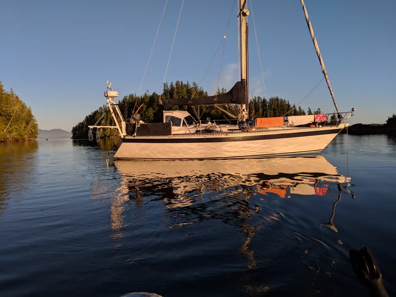 We did some more fishing before making the very short hop into the Pinkerton Islands, described in the Douglas guidebook as "virtually bombproof." The Pinekrtons are just north of the Broken Group and are not part of the protected marine sanctuary and park. I eschewed the small gunkhole described in the Dreamspeaker guidebook, preferring the larger basin Douglas recommends. Again, it was uncrowded with only one other boat there ahead of us. Later we were joined by a third boat. I don't know if we were just early in the summer cruising season, but it felt like there was nobody cruising Barkley Sound other than us and maybe 10 other boats. Dozens and dozens of little sport fishing boats, but almost nobody anchoring out. All our anchorages were very calm and well-protected, making for blissful boat sleep appreciated by all.