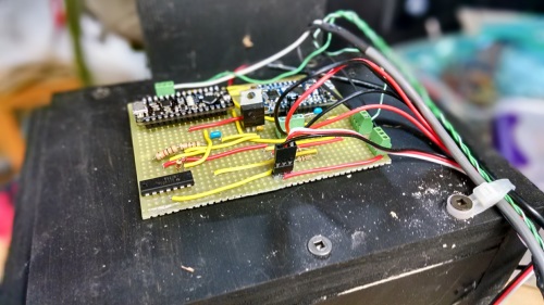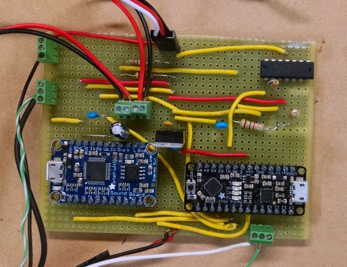In the past Red ran on an Arduino Duemilanove and an Adafruit Wave Shield. The Wave Shield is getting pretty long in the tooth. Frankly the only reason one would select it today is that the sd card gives you practically no limit on how much audio you can access. I noticed some flakiness in Red last year, especially on clear afternoons when the sunlight through the plexiglas panel at the front of Red's enclosure would turn it into a greenhouse. I never really liked the SD card and potentiometer volume dial on the Wave shield. I've had it get fussy about the SD card, and it can be staticy when adjusting the volume potentiometer. Right or wrong, I felt this was not a great solution for the harsh outdoor environment where Red makes his annual command performance. And there are better options now.