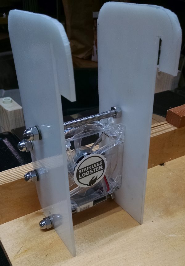 Rather than screwing things to the inner wall of the fridge, which is never a great idea really as it compromises the insulation even more than it already is, I could make some brackets to hang on the lip of the evaporator and use threaded rod and nuts to make a tight friction fit to hold the fan assembly in place. Fortunately I have a large stock of random plastic sheet goods scraps from Boeing Surplus, inherited from retired Boeing engineer George Trusk. I sandwiched the fan assembly between two pieces of plastic using stainless threaded rod and nuts to hold it together. I added two threaded rods just to act as guards against mayhem on the outer exposed face of the fan.