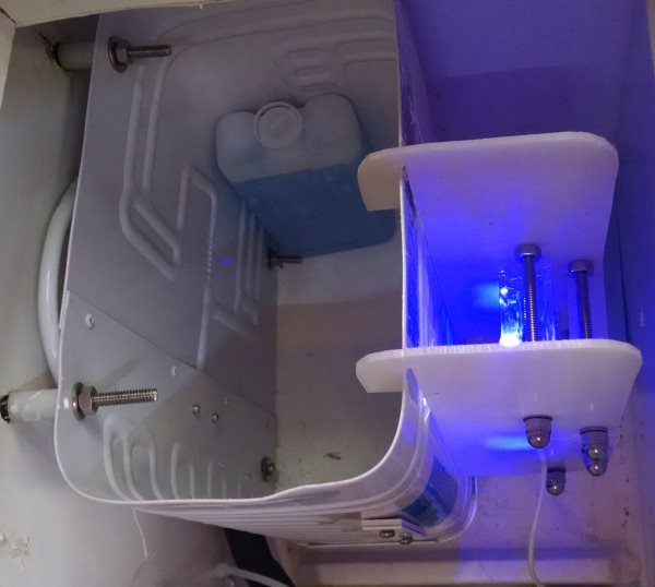 Last year, one of the 11th hour projects was to replace the fridge compressor and evaporator and install a cool little gizmo that goes by the name Stainless Lobster. Don't ask me about the name...the only thing I can figure is that it is meant to stick in your head like an earworm when someone mentions it to you. It is a microcontroller that takes over the fridge's thermostat and compressor duty cycle. One of my favorite features is the fine control it gives you over boosting the compressor, both in terms of how hard it is worked and how long, to put some cold in the bank when the alternator or battery charger are engaged and you have amps to burn. It also lets you program a recurring defrost cycle where it shuts the compressor off and runs a fan over the evaporator. Less frost means higher efficiency.